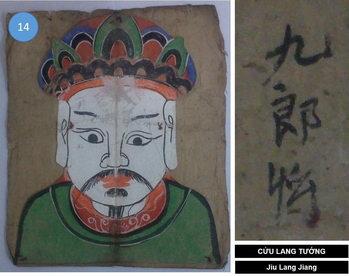 Sách của Jess. J. Pourret dẫn hình của một vị thần và cho rằng đây là Ngọc Hoàng (Nyut Hung) do bởi dấu hiệu là hai thiên thần ở hai bên vai. Tôi mơ hồ cho rằng đó không phải là nhận định chính xác. Tôi cũng có một cái mặt nạ được vẽ tương tự như vậy nhưng lại có tên rõ ràng được viết lên phía trước là Đế Mẫu Tướng Nhị. Tương tư như mặt nạ Đế Mẫu bên trên, mặt nạ này cũng có hai đứa trẻ (thiên thần?) hai bên vai, tuy nhiên lạ một điều Đế Mẫu tại sao lại có râu. Cái sự dở dang của một câu hỏi chờ lời đáp âu cũng là một thú vui khác của người sưu tầm vậy.